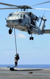 | Keywords: Defense.gov News Photo 090612-N-3659B-580.jpg en A U S Navy explosive ordnance disposal technician assigned to Mobile Unit 11 Platoon 0-2 fast-ropes onto the flight deck of the aircraft carrier USS Ronald Reagan CVN 76 during a training exercise in the Pacific Ocean on June 12 2009 The exercise is a combined effort between the explosive ordnance disposal team and Helicopter Anti-submarine Squadron 4 The Reagan is underway on deployment to the western Pacific 090612-N-3659B-580 http //www defense gov/photos/newsphoto aspx newsphotoid 11377 2009-06-12 en Petty Officer 2nd Class Joseph M Buliavac U S Navy PD-USGov-Military Import by User Slick-o-bot/Defense gov News Photos Taken with Nikon D300 Training on USS Ronald Reagan CVN-76 Fast roping UH-60 class helicopters Helicopter Anti-Submarine Squadron 4 United States Navy |