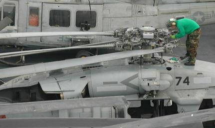 | Keywords: Defense.gov News Photo 051201-N-9866B-002.jpg en A Navy airman scrutinizes the rotor head of a SH-60S Seahawk helicopter prior to flight operations on the flight deck of the amphibious assault ship USS Peleliu LHA 5 as the ship operates in the Pacific Ocean on Dec 1 2005 Peleliu is off the coast of Southern California for an expeditionary strike group exercise 051201-N-9866B-002 Navy http //www defense gov/photos/newsphoto aspx newsphotoid 7381 2005-12-01 en Petty Officer 2nd Class Zack Baddorf U S Navy PD-USGov-Military-Navy Defense gov news media for December 2005 Import by User Slick-o-bot/Defense gov News Photos SH-60 Seahawk Taken with Nikon D70 Aboard USS Peleliu LHA-5 |