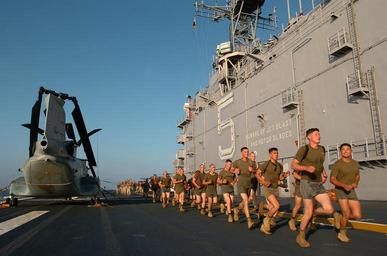 | Keywords: Defense.gov News Photo 051112-N-9866B-034.jpg en Marines of the 11th Marine Expeditionary Unit perform their physical training on the flight deck of the amphibious assault ship USS Peleliu LHA 5 as the ship operates in the Pacific Ocean on Nov 12 2005 Peleliu is off the coast of Southern California for an expeditionary strike group exercise 051112-N-9866B-034 Navy http //www defense gov/photos/newsphoto aspx newsphotoid 7371 2005-11-12 en Petty Officer 2nd Class Zack Baddorf U S Navy PD-USGov-Military-Navy Defense gov news media for November 2005 Import by User Slick-o-bot/Defense gov News Photos Photos taken with Nikon D2H 11th Marine Expeditionary Unit Aboard USS Peleliu LHA-5 United States Marine Corps training |