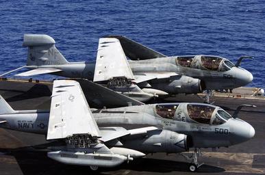 | Keywords: Defense.gov News Photo 050818-N-6106R-058.jpg en Two Navy E/A-6B Prowlers sit with wings folded as they wait to be catapulted off the flight deck of the USS Kitty Hawk CV 63 on Aug 18 2005 The all weather Prowler provides protection for strike aircraft ground troops and ships by jamming enemy radar electronic data links communications and obtains tactical electronic intelligence within the combat area 050818-N-6106R-058 Navy http //www defense gov/photos/newsphoto aspx newsphotoid 6984 2005-08-18 en Airman Stephen W Rowe U S Navy PD-USGov-Military-Navy Defense gov news media for August 2005 Import by User Slick-o-bot/Defense gov News Photos Grumman EA-6 Prowler on flight decks Photos taken with Nikon D2H |