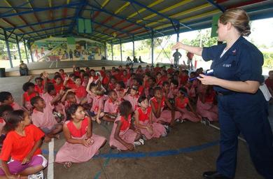 | Keywords: Defense.gov News Photo 050517-N-7027P-074.jpg en Dental Technician 2nd Class Deborah McLeod engages the students of the Modilion International School in Madang Papua New Guinea during a question and answer period as she instructs the students in the proper use of a toothbrush on May 17 2005 U S Navy medical personnel assigned to the hospital ship USNS Mercy T-AH 19 visited schools throughout the city of Madang to teach students the importance of disease prevention dental hygiene and proper diet The Mercy and combat stores ship the USNS Niagara Falls T-AFS 3 are on station off the coast of New Guinea to provide humanitarian assistance and focused medical care to the residents of the area 050517-N-7027P-074 Navy http //www defense gov/photos/newsphoto aspx newsphotoid 6573 2005-05-17 en Petty Officer 2nd Class Sandra M Palumbo U S Navy PD-USGov-Military-Navy Defense gov news media for May 2005 Import by User Slick-o-bot/Defense gov News Photos Defense gov photos requiring renaming Taken with Nikon D1H USNS Mercy T-AH-19 |