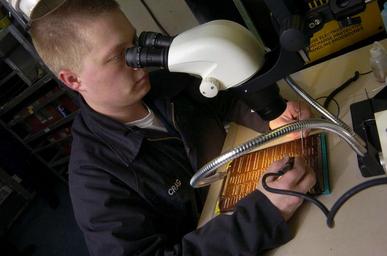 | Keywords: Defense.gov News Photo 050305-N-1485H-059.jpg en Petty Officer 2nd Class Robert Craig repairs a micro-miniature circuit card in the Avionics Work Center aboard the USS Kitty Hawk CV 63 as the ship operates in the Pacific Ocean on March 5 2005 Craig is a Navy aviation electronics technician assigned to the aircraft carrier's Aircraft Intermediate Maintenance Department 050305-N-1485H-059 Navy http //www defense gov/photos/newsphoto aspx newsphotoid 6225 2005-03-05 en Petty Officer 3rd Class Lamel J Hinton U S Navy PD-USGov-Military-Navy Defense gov news media for March 2005 Naval ships of the United States Import by User Slick-o-bot/Defense gov News Photos Defense gov photos requiring renaming Photos taken with Nikon D2H |