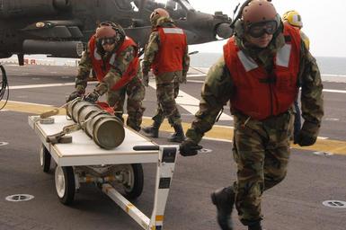| Keywords: Defense.gov News Photo 050201-N-5455M-002.jpg en U S Army armament specialists transit the flight deck of the USS Nassau LHA 4 during joint shipboard weapons and ordnance training as the ship operates in Atlantic Ocean on Feb 1 2005 Army personnel are aboard the amphibious assault ship to train alongside Navy aviation ordnancemen in a joint training environment 050201-N-5455M-002 Navy http //www defense gov/photos/newsphoto aspx newsphotoid 6060 2005-02-01 en Petty Officer 2nd Class Susan Milton U S Navy PD-USGov-Military-Navy Defense gov news media for February 2005 Military training Import by User Slick-o-bot/Defense gov News Photos Defense gov photos requiring renaming Taken with Nikon D100 United States Army USS Nassau LHA-4 |