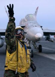 | Keywords: Defense.gov News Photo 041224-N-5345W-129.jpg en Petty Officer 3rd Class Jason Baty relays a signal to other flight deck crew of the aircraft carrier USS Harry S Truman CVN 75 as an F/A-18C Hornet taxis towards the catapult for launch on Dec 24 2004 Truman and its embarked Carrier Air Wing 3 is providing close air support and conducting intelligence surveillance and reconnaissance missions over Iraq Baty is a Navy Aviation Boatswain's Mate Aircraft Handler The Hornet is assigned to Strike Fighter Squadron 37 041224-N-5345W-129 Navy http //www defense gov/photos/newsphoto aspx newsphotoid 5905 2004-12-24 en Airman Kristopher Wilson U S Navy PD-USGov-Military-Navy Defense gov news media for December 2004 Import by User Slick-o-bot/Defense gov News Photos Taken with Nikon D1X USS Harry S Truman CVN-75 F/A-18C Hornet on flight decks |