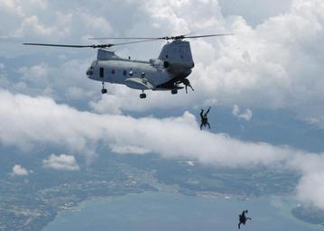 | Keywords: Defense.gov News Photo 040804-N-7512V-106.jpg en Soldiers dive off the back ramp of a U S Marine CH-46E Sea Knight helicopter as they perform High Altitude Low Opening jumps on Aug 4 2004 The soldiers are attached to the 1st Battalion 1st Special Operations Airborne Unit The helicopter is assigned to Marine Medium Helicopter Squadron 262 near Okinawa Japan 040804-N-7512V-106 Navy http //www defense gov/photos/newsphoto aspx newsphotoid 5348 2004-08-04 en Petty Officer 3rd class Kaitlyn Rae Vargo U S Navy PD-USGov-Military-Navy Defense gov news media for August 2004 Import by User Slick-o-bot/Defense gov News Photos CH-46 Sea Knight Images from US Navy location Okinawa Japan People jumping out of helicopters Taken with Nikon D1H United States Marine Corps in Okinawa prefecture Aerial photographs of Okinawa prefecture Motobu Okinawa |