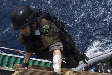 | Keywords: Defense.gov News Photo 090501-N-1251W-049.jpg en U S Navy Petty Officer 1st Class Marc Morency a member of the USS Fitzgerald's DDG 62 visit board search and seizure team climbs up a pilot ladder to board the Indian navy supply ship INS Jyoti A58 during Malabar 2009 in the Pacific Ocean on May 1 2009 Malabar is a trilateral exercise between the U S India and Japan involving air surface and sub-surface warfare 090501-N-1251W-049 http //www defense gov/photos/newsphoto aspx newsphotoid 11220 2009-05-01 en Petty Officer 2nd Class Matthew R White U S Navy PD-USGov-Military Import by User Slick-o-bot/Defense gov News Photos Defense gov News Photos related to India Relations of India and the United States in 2009 Taken with Nikon D100 Malabar 2009 INS Jyoti A58 |