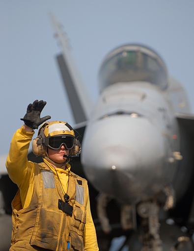 | Keywords: Defense.gov News Photo 080513-N-5384B-036.jpg en A U S Navy aircraft director signals to a tractor driver during flight operations aboard the Nimitz-class aircraft carrier USS Abraham Lincoln CVN 72 while underway in the Persian Gulf on May 13 2008 The Lincoln is deployed to the U S Navy 5th Fleet area of responsibility to support maritime security operations 080513-N-5384B-036 http //www defense gov/photos/newsphoto aspx newsphotoid 10231 2008-05-13 en Petty Officer 3rd Class Justin Blake U S Navy PD-USGov-Military Import by User Slick-o-bot/Defense gov News Photos Aboard USS Abraham Lincoln CVN-72 Taken with Nikon D200 USS Abraham Lincoln CVN-72 flight deck |