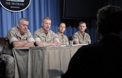 | Keywords: Defense.gov News Photo 080502-N-2855B-051.jpg en U S Marine Lt Col Paul Rock 2nd from left answers a reporter's question about the initial combat deployment of the MV-22 Osprey during a Pentagon press briefing in Arlington Va on May 2 2008 Rock Deputy Commandant for Marine Corps Aviation Lt Gen George J Trautman III left Capt Sara Faibisoff 2nd from right and Marine Sgt Danny Herrman discussed experiences as the first unit to take the MV-22 Osprey into combat Rock Faibisoff and Herrman are attached to Marine Medium Tiltrotor Squadron 263 080502-N-2855B-051 http //www defense gov/photos/newsphoto aspx newsphotoid 10198 2008-05-02 en Petty Officer 2nd Class Molly A Burgess U S Navy PD-USGov-Military Import by User Slick-o-bot/Defense gov News Photos Defense gov photos requiring renaming Bell-Boeing V-22 Osprey USMC Taken with Nikon D200 MV-22B Osprey Marine Medium Tiltrotor Squadron 263 George J Trautman III Paul J Rock Jr |
