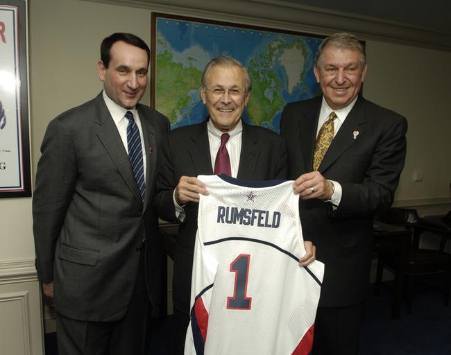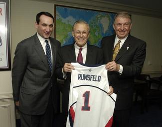| Keywords: Defense.gov News Photo 060406-N-0696M-067.jpg en USA Basketball Men's Senior National Team Head Coach Mike Krzyzewski left and USA Basketball Men's Senior National Team Managing Director Jerry Colangelo right flank Secretary of Defense Donald H Rumsfeld as he is presented a Team USA basketball jersey in the Pentagon in Arlington Va on April 6 2006 Basketball superstars Chris Mullin Chasity Melvin Buck Williams Ruthie Bolton David Robinson Coach Krzyzewski and Coach Chuck Daly are in the Pentagon to hold a special basketball clinic for children of deployed and active duty military members as part of April's National Month of the Military Child 060406-N-0696M-067 Navy http //www defense gov/photos/newsphoto aspx newsphotoid 7856 2006-04-06 en Petty Officer 1st Class Chad J McNeeley U S Navy PD-USGov-Military-Navy Defense gov news media for April 2006 Import by User Slick-o-bot/Defense gov News Photos Defense gov photos requiring renaming Donald Rumsfeld in 2006 Taken with Nikon D2X 2006 in Virginia Mike Krzyzewski Jerry Colangelo Interior of The Pentagon Number 1 on sportswear United States men's national basketball team |