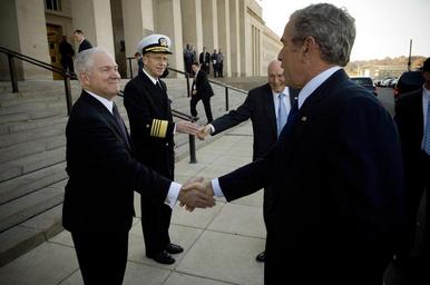 | Keywords: Defense.gov News Photo 071129-N-0696M-094.jpg en Secretary of Defense Robert M Gates left and Chairman of the Joint Chiefs of Staff Adm Mike Mullen 2nd from left U S Navy greet President George W Bush right and Vice President Dick Cheney on the steps of the Pentagon on Nov 29 2007 The senior leaders will hold a meeting discussing long-term strategic plans for the military with the Joint Chiefs of Staff and Deputy Secretary of Defense Gordon England 071129-N-0696M-094 Navy http //www defense gov/photos/newsphoto aspx newsphotoid 9733 2007-11-29 en Petty Officer 1st Class Chad J McNeeley U S Navy PD-USGov-Military Import by User Slick-o-bot/Defense gov News Photos George W Bush in 2007 Michael G Mullen in 2007 Robert Gates in 2007 Taken with Nikon D2Xs Handshakes involving the military Handshakes involving politicians |