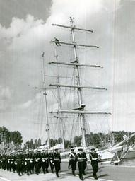 Keywords: Defilada poodzdziałów.jpg pl 11 sierpnia 1982r-Defilada podpodziałów przed okrętem own Żeglarz 11 sierpnia 1982r pl ORP Iskra okręt szkolny 1982 ORP Iskra ship 1982 Black and white photographs