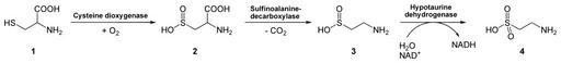 | Keywords: Degradation of Cysteine to Taurine.svg en ox degradation of cysteine to taurine dioxygenase<ref>http //www expasy org/enzyme/1 13 11 20 EC-Nummer 1 13 11 20 Cysteindioxygenase </ref> zu 3-Sulfinoalanin 2 oxidiert Dieses wird zu Hypotaurin 3 decarboxyliert katalysiert durch die Sulfinoalanindecarboxylase<ref>http //expasy org/enzyme/4 1 1 29 EC-Nummer 4 1 1 29 Sulfinoalanindecarboxylase </ref> Schließlich wird Hypotaurin zu Taurin 4 unter NAD<sup>+</sup>-Verbrauch durch die Hypotaurindehydrogenase<ref>http //expasy org/enzyme/1 8 1 3 EC-Nummer 1 8 1 3 Hypotaurindehydrogenase </ref> oxidiert Own 2008-05-26 Yikrazuul Amines Sulfonic acids Taurine Biosyntheses Amino acid metabolism |