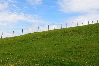 Keywords: demarcation barbed wire fence hill mountain slope meadow nature green grass hilly increase in skewness tilt horizon wide clouds