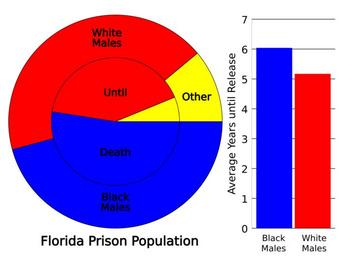 | Keywords: Demography of Florida Prisons.svg translate yes en Black and white males make up the majority of the prison population but white males are 4 less likely to be serving a life or effectively life sentence death sentence or release after age 100 and black males are 15 more likely to be serving a life or effectively life sentence Women are 60 less likely to be serving a life or effectively life sentence Of those who will be released before they reach age 100 the remaining time for black males is 17 longer than for white males The percentage of white males scheduled to be released when they are from 75 to 99 years old is 27 greater and for black males 19 less likely Data from the Florida Department of Corrections as of February 2015 http //www dc state fl us/ 2015-02-27 own Delphi234 other versions Data wikitable sortable Demographic Population Percent Release<br>in years 75-99 at release Death in prison - Black male 46 521 45 78 6 04 859 36 87 7 198 52 49 - White male 43 852 43 15 5 17 1 278 54 85 5 665 41 31 - White female 4 843 4 77 2 98 74 3 18 194 1 41 - Hispanic male 3 659 3 60 5 83 81 3 48 436 3 18 - Black female 2 129 2 09 1 73 24 1 03 114 0 83 - All others male 320 0 31 7 19 64 0 47 - Hispanic female 189 0 19 4 19 3 0 13 14 0 10 - American Indian male 79 0 08 5 18 8 0 34 23 0 17 - All others female 12 0 01 4 08 2 0 01 - Asian male 12 0 01 11 30 3 0 13 3 0 02 - American Indian female 9 0 01 1 20 1 0 01 - Asian female 2 0 00 5 33 - class sortbottom Total 101 627 2 330 13 714 cc-zero Uploaded with UploadWizard Correctional population statistics for the United States Demographics of Florida |