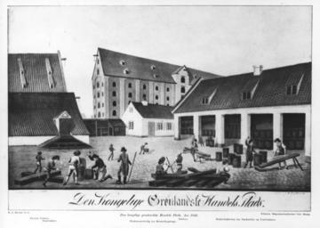 Keywords: Den Kongelige Grønlandske Handels Plads (1818).jpg en Den Kongelige Grønlandske Handels Plads on Christianshavn in Copenhagen Denmark http //www bryggen dk/images/Maleri 20af 20pakhuset 20mlm jpg N J Bredal 1818 PD-old Christianshavn