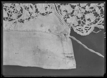 | Keywords: Den yttersta av Gustav II Adolfs Lützenskjortor - Livrustkammaren - 26636.tif LSH artwork sv Rester av skjorta i 3 delar ryggstycke med en bit av kragen v framstycke med kragstycke och större delen av ärmen samt h framstycke med kragens främre halva och en del av bakstycket <br/><br/>1 Ryggstycket med en bit av kragen <br/>Skjortans vådbredd har i h ö sida utökats med en våd av 460 mm som tillför plagget en bredd av 230 mm på resp fram- och bakstycket På ryggsidan är denna fåll gjord som stad mot stad - sammankastad fåll från avigsidan av plagget 7 kaststygn åt v med H-tvinnat lingarn Av denna fåll finns nerifrån kantfållen kvar 350 mm sedan har sannolikt från sprundet klippts och rivits en stor lucka av sömmen saknas 360 mm sedan kommer på nytt ett 630mm långt stycke av kastfållen Okstycket är här blott ett oregelbundet klippt stycke med snedklippt överkant På V sida som rivits av utefter sidfållen - fällsömmen finns blott ytterligare ett stycke av ärmspjället kvar och en liten bit 40 mm av dess söm mot ärmen Spjällets kant är här 150 mm Fållen sydd med h-tvinnat lingarn med 6 stygn /cm och drygt 1 mm bredd Av kragen återstår i underkanten en 145 mm lång bit Upptill blott en 100 mm lång bit där spetsen sytts fast med 8 stygn kast- åt V/cm med H-tvinnat lingarn Kragen är 670 mm hög I kragen har ca 16 rynkor stripats och 7 kaststygn åt H sytts ned på rätan och ca 7 stygn/cm i de tättplacerade parallella garneringssömmarna Hela arrangemanget är ej mer än 3 mm brett H-tvinnatlingarn har använts till garneringssömmarna Den breda uddspetsen med bl a flätslag är 50 mm bred den smala 15 mm Den breda har en rapport av ca 24 mm <br/><br/>2 Ett stycke av skjortans V framsida med kragstycke och större delen av ärmen <br/>Största längd fram är från kragens underkant max 530 mm och 140 mm halssprund finns kvar Här är också vådbredden bevarad mellan halssprund och ärmsöm Av ärmsömmen finns det 290 mm kvar varav 220 ovanför spjället som alltså är bevarat som en 70 mm bred remsa och här är spjället klippt snett ½ våden verkar då att vara 595 à 600 mm bred på v bröstsida Slätt parti fram på axeln är ungefär 200 mm enligt detta stycke att döma Ärmmanschetten är 45 mm bred med stripade veck ca 12 veck/cm och 7 stygn såväl mellan dessa som i de 2 garneringsraderna hela dekorens bredd 3 mm Spetsen är densamma som på kragen Manschettstyckena är mycket blodiga <br/><br/>3 H framstycke fr o m halssprundet med kragens främre halva och en del av bakstycket av kragen hela axelsömmen samt en övre del av ärmen med spjället - som dock har en reva En ände till1150 mm nående remsa finns av skjortans framstycke från axelsömmen räknat Nederst är denna blott 110 mm bred och då den tydligen har klippts av när tyget redan låg veckat är dess kant uddig souvenir Axelsömmen är 160 mm och sneddad så att den är 130 mm vid axeln men krymper till blott ett par mm vid halsen På rätsidan är det ryggstycket som går över framstycket 3 sömmar med 7-8 stygn/cm Det övriga tyget - de ca 420 mm har rynkats samman i kragen till 100 mm Fällsömmen som förenar framstyckets med sidovåden är gjord för att bli särskilt smidig från skjortans insida med 7 kaststygn åt V gjort från rätan över staden Fållen är blott millimeterbred Av kragen finns i nederkanten en 160 mm lång bit I överkanten är den dock inte mycket mer än 130mm från hörnet räknat Längs överkanten står den smala uddspetsen upp och den löper utefter halssprundet mitt fram På kragens horisontella del är från överkanten och nedfallande en bredare uddspets fästad <br/><br/>Gemensamt <br/><br/>Av linnelärft med trådantal 43 varptrådar x 44 inslagstrådar / cm2 sammanfogad av framstycke bakstycke b 1470 mm sidstycke samt ärmar ärmspjäll krage och ärmlinningar I sidorna har nertill ämnats ca 510 mm höga sprund staden är synlig här i v sida Skjortans bålparti är rakt tillskuret Nedtill har skjortan fållats upp med en 15-20 mm bred fåll sydd med 5 à 6 stygn/cm av H-tvinnat lingarn De rektangulärt tillskurna ärmarna blott den v någorlunda bevarad är 610 mm långa och 460 mm breda och garnerade med 3 rader knappt 20 mm breda vita knypplade mellanspetsar påsydda med ca 100 mm mellanrum Ärmarna är fastsydda i skjortans sidsöm på v sida där staderna stöta mot varandra I h sida har man klippt upp ett 390 mm långt sprund för ½ ärmbredden 230 mm + spjäll 160 mm 390 mm Nedanför ärmstycket har alltså ett spjäll med ca160 mm sida sytts fast Ärmarna är alltså isydda helt normalt och inte som Anna Maja Nylén förmodat enligt en mer egendomlig konstruktion så att ärmen skulle nå ända fram till halslinningen <br/><br/>Axelsömmarna är i det allra närmaste helt raka de yttersta 165 mm Man har blott vikt ner fållarna något bredare mot axeln än mot halsen ca 5 mm differens Härefter har ll återstående vidd rynkats in i den dubbelvikta knappt 70 mm håga kragen som är ca 400 mm lång så att frampartierna av skjortorna fördelats på kragens främre decimeterlånga stycken medan ryggstycket rynkats i kragens bakre 200 mm <br/><br/>Halssprundet är klippt upp vertikalt i framstycket l minst 270 mm synligt i h sida där spetsgarneringen bevarats en 15 mm bred uddspets Dessutom kan påpekas att sprundet ej placerats helt symmetriskt mitt på skjortans framstycke utan med ett par centimeters förskjutning åt h då det klippts ca 600 mm från v sidsöm och 230 + 350 580 mm från h sida Dekor av en 15 mm bred uddspets rapport 20 mm Överst på kragen är denna typ av spets fastsydd för att stå upp som en avslutande kant På kragens utsida är kant i kant med den smala spetsen och nedåt en bredare uddspets fastsydd Denna är 50 mm bred och har en rapport av 22 mm motivet påminner om solfjädrar <br/><br/>Kragens garneringssömmar sydda med efterstygn i 2 parallella rader med 7 stygn/cm och 16 rynkor a