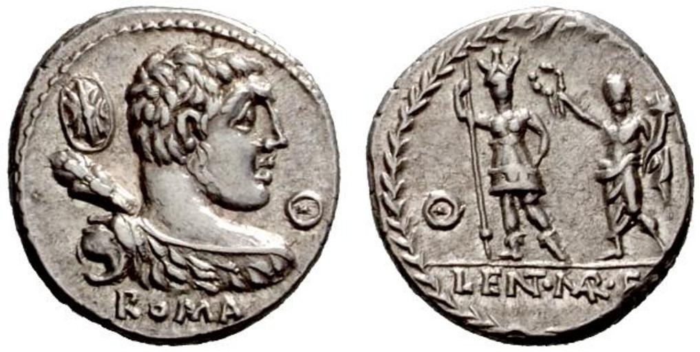 MAKE A MEME View Large Image Denarius Publius Cornelius Lentulus Marcellinus 1.jpg en d 18 mm P Cornelius Lentulus Marcellinus Denarius circa 100 AR 3 92 g Bust of Hercules seen from behind with lion skin over shoulder and head turned r ; club over far shoulder In ...
