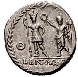 | Keywords: Denarius Publius Cornelius Lentulus Marcellinus 1 Reverse.jpg en d 18 mm P Cornelius Lentulus Marcellinus Denarius circa 100 AR 3 92 g Bust of Hercules seen from behind with lion skin over shoulder and head turned r ; club over far shoulder In field l shield and below chin Q Rev Roma standing facing holding spear crowned by male figure standing l and holding cornucopiae in l hand; in field l Q In exergue LENT·MAR·F The whole within laurel wreath FFC 620 B Cornelia 25 Syd 604a Cr 329/1b ru Дена ий се еб о Дата чеканки 100 г до н э онетный дво Рим вес 3 92 г диамет 18 мм АВЕРС Бюст молодого Ге кулеса в шку е льва вп аво отве нушись от з ителя; на левом плече дубина; за головой щит; под бюстом ROMA; спе еди г еческая буква Ο с точкой Кайма из точек РЕВЕРС Рома в домпехах стоит анфас де жит копье упе евшись левой укой в бед о; ее увенчивает венком Гений имского на ода кото ый де жит ог изобилия в левой уке; в поле слева г еческая буква Ο с точкой В об езе LENT MAR F NT MAR моног аммой Lentulus Marcelli filius Кайма из лав ового венка http //www acsearch info/record html id 133770 Author I century B C Denarius Publius Cornelius Lentulus Marcellinus moneyer 100 BC Personifications of Rome PD-old |