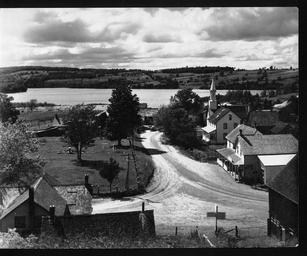 However, this photo is reversed. It is looking south from the hill overlooking the current firehall, but it is turned 180°. The description below is accurate, with the exception that the church is really on the left or east side of the road.