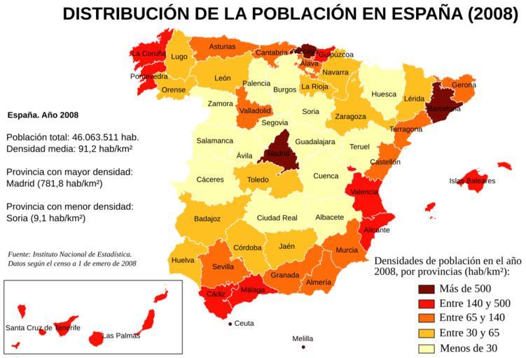 | Keywords: Densidades de población en España (2008).svg Mapa de España con las densidades de población por provincias según el censo del Instituto Nacional de Estadística a 1 de enero de 2008 _Densidades_de_poblaci C3 B3n_en_Espa C3 B1a_ 2007 svg 2009-01-01 22 45 UTC derivative work Chusete <span class signature-talk >talk</span> _Densidades_de_poblaci C3 B3n_en_Espa C3 B1a_ 2007 svg Creado por Rodriguillo tomando como mapa base Image Provinces of Spain svg creado por Emilio Gómez Fernández Densidades_de_poblaci C3 B3n_en_Espa C3 B1a_ 2007 svg Original upload log This image is a derivative work of the following images File _Densidades_de_poblaci C3 B3n_en_Espa C3 B1a_ 2007 svg licensed with PD-user 2008-02-02T13 17 50Z Rodriguillo 568x387 1566889 Bytes <nowiki> </nowiki> 2008-02-02T12 56 42Z Rodriguillo 568x387 1566890 Bytes <nowiki> Summary Mapa de España con las densidades de población por provincias según el censo del Instituto Nacional de Estadística a 1 de enero de 2007 Instituto Nacional de</nowiki> Population density maps of Spain |
