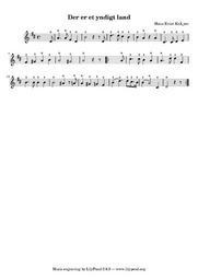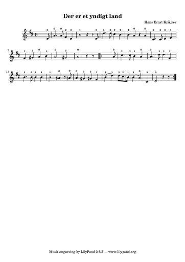 | Keywords: Der er et yndigt land-violin.png Danish national anthem lyrics by Adam Oehlenschläger The sheet music is with help for beginner violin LilyPond source <pre> \include deutsch ly \version 2 6 4-5 \header title Der er et yndigt land composer Hans Ernst Krøyer melody \clef treble \time 4/4 \key d \major \relative c' s2 s4 s8 d-0 a'4 -0 a8-0 fis4-2 d-0 h'2-1 r4 r8 d -0 d'4 -3 d8-3 cis4-2 h-1 h-1 a-0 r a-0 cis 4 -3 cis8-3 d4-0 e-1 fis4-2 gis-3 a-0 h-1 a2-0 gis-3 a-0 r4 r8 s8 \bar \repeat volta 2 s2 s4 s8 a-0 cis4 -2 cis8-2 h4-1 a-0 a4 -0 d8-3 d4-3 fis -2 h4 -1 h8-1 h4-1 h-1 h2-1 ais4-0 r8 a-0 a4-0 gis-3 g-3 fis-2 h-1 d4 -3 d8-3 cis8 -2 h16-1 h4-1 a2-0 cis 4-3 d2-0 r4 r8 s8 \score \new Staff \melody </pre> Also See Der_er_et_yndigt_land mid Find midi here <br> Der_er_et_yndigt_land ogg Find Ogg here <br> thumb 250px left Music Sheet <br style clear both; > PD-old Anthems of Denmark Sheet music |