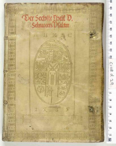 | Keywords: Der sechste theil des Psalters Dauids, aussgelegt, vnd auffs newe vbersehen, durch Nicolaum Selneccerum. -126-150.- - Upper cover (c108d29).jpg Style Armorial Panel design Lettered cover eg intitals titles Dated; Caption Upper cover; Colour White / cream; Edge Unspecified exhibition history Decorative Technique Tooled in gold Printed/other transfer process; Cover Material Parchment may include vellum Traces of 2 pairs of ties With the arms and initials of Augustus I Elector of Hanover dated 1585 Title in red Vellum flap extends over fore edge Macchi states; bound in 1585 in Saxony by Caspar Meuser C Schmidt Jakob Krause pl 74 1 st line 1 st Meuser panel-stamp Saxony 13 compartments A very similar example is owned by the Landesbibliothek Dresden on Bericht Wie die Tabeln in Beschickung der Golder auff Rheinisch Gulden zu 18 Karatt 6 gren goldt haltend Und der Zursatz mit Weiss oder Roth gebraucht werden sollen ms about 1585 shelfmark Mscr J 354 Deutsche Bucheinbände der Renaissance n 89 This kind of cover corresponds to the medieval ledger binding First at August Kurfürst court the manuscript or printed text were chosen and the binding richly decorated During Meuser's time texts were bound according to this style and thought of as traveling library this explains the tendency to use a richer decoration The red title also present on the Dresden example disturbs the general layout it seems therefore possible that it was added later to the owner's order The little azured border medallions shows the French influence decoration The same panel-stamp was tooled in blind on Johannes Claius Grammatica Germanicae Linguae Leipzig Hans Rambau 1578 Berlin National Library shelfmark Y 3931 Deutsche Bucheinbände der Renaissance n 89 object history Text 1585; Dresden; August I Elector of Hanover object type Cc-zero place of creation Binding Germany place of discovery Unspecified British Library image http //www bl uk/catalogues/bookbindings/LargeImage aspx RecordId 020-000004540 ImageId ImageId 41875 Copyright BL Der sechste theil des Psalters Dauids aussgelegt vnd auffs newe vbersehen durch Nicolaum Selneccerum 126-150 Uploaded with GWToolset Der sechste theil des Psalters Dauids aussgelegt vnd auffs newe vbersehen durch Nicolaum Selneccerum 126-150 - Upper cover c108d29 http //www webarchive org uk/bldatasets/bindings/6448_4 jpg Bookbinding 16th-century bookbinding British Library Bookbindings |