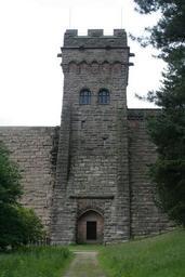 Keywords: Derwent Dam tower.jpg The eastern tower of Derwent Dam on Derwent Reservoir Derbyshire England Viewed from the lower side the south Own 2007-06-19 Dave Pape PD-user Davepape Derwent Dam