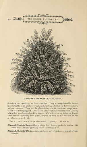 Keywords: Descriptive catalogue of new and beautiful roses (16249135048).jpg DEUTZIA G-RAC11 IS See page 25 <br> situations and requiring but little attention They are very desirable in fact <br> indispensable in all kinds of ornamental planting whether in door-yard lawn <br> park or cemetery They may be planted singly or in groups or clumps as oc- <br> casion or taste may suggest Their season of bloom lasts for several weeks during <br> which they are objects of striking beauty We believe we are doing our friends <br> a real service in offering these plants prepaid by mail so that they can be had <br> at trifling expense by all <br> Price 25 cents each except where noted 5 FOR 1 12 FOR 2 <br> Almond Double Rose Height three feet ; flowers perfectly double like <br> small roses ; blooms profusely before the leaves show <br> Almond Double White Same as above only white flowers instead of rose- <br> colored 43902562 150007 78561 Page 24 Text http //www biodiversitylibrary org/page/43902562 1875 10 5962/bhl title 78561 Dingee Conard Co ; Henry G Gilbert Nursery and Seed Trade Catalog Collection NameFound Deutzia NameConfirmed Deutzia EOLID 11171771 NameBankID 2649641 Biodiversity Heritage Library Descriptive catalogue of new and beautiful rosesnew album Garden Stories Catalogs Flowers Roses Seeds Trade catalogs U S Department of Agriculture National Agricultural Library bhl page 43902562 dc identifier http //biodiversitylibrary org/page/43902562 bhlgardenstories deutzia gracilis Dingee Conard Co taxonomy binomial Deutzia gracilis BHLinbloom u s department of agriculture national agricultural library dingee conard co taxonomy binomial deutzia gracilis bhlinbloom Information field Flickr posted date ISOdate 2015-02-03 CC-BY-2 0 BioDivLibrary https //flickr com/photos/61021753 N02/16249135048 2015-08-24 05 54 58 cc-by-2 0 PD-old-70-1923 Descriptive catalogue of new and beautiful roses Photos uploaded from Flickr by FĂŚ using a script |