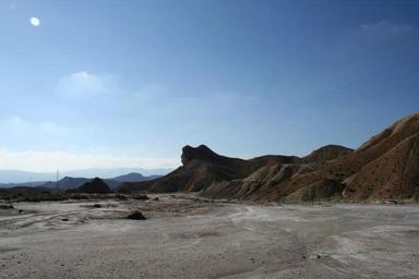 Keywords: desert arid dry landscape volcanic rock desert landscape sunny blue sky mountain land geological geology panorama spain andalusia wires telephone mast aerial telegraph pylon