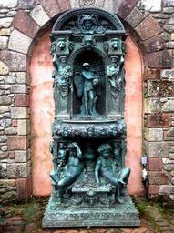 Keywords: design fountain wall bricks red exhibit nymph people art artistic green statue creativity
