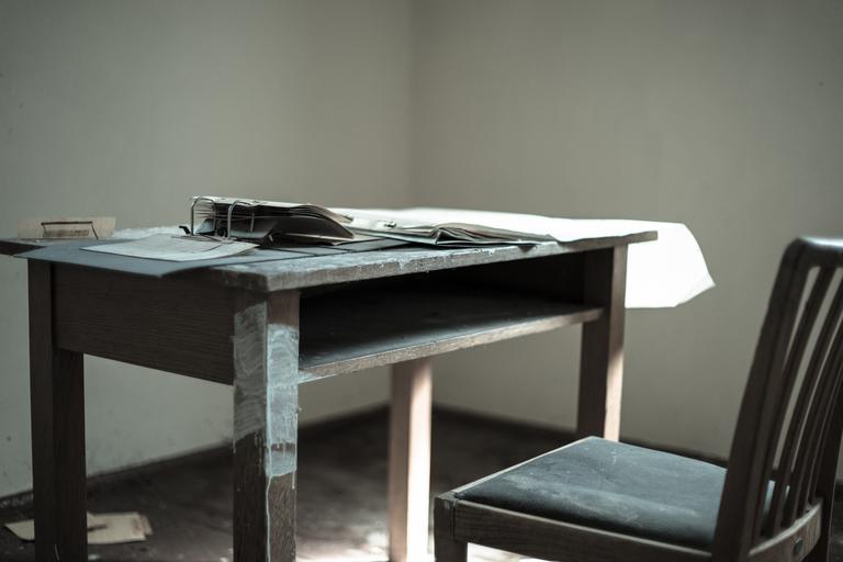 Keywords: desk table paper chair old ruin office abandoned dirty lost place weathered forgotten nostalgia neglected vintage