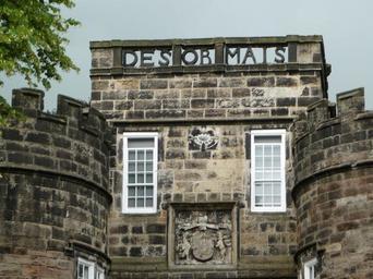 Keywords: Desormais Skipton.jpg en Skipton own Immanuel Giel 2010-07 Skipton Castle gatehouse Reliefs of coats of arms in England Mottos July 2010 in North Yorkshire
