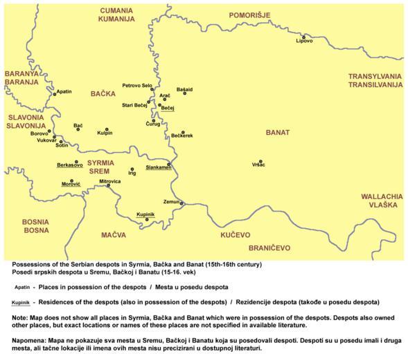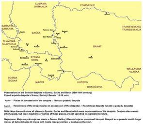 | Keywords: Despotski posedi.png Possessions of the Serbian despots in Syrmia Bačka and Banat 15th-16th century <br>Posedi srpskih despota u Sremu Bačkoj i Banatu 15-16 vek own 2013 PANONIAN Cc-zero References Dr Aleksa Ivić Istorija Srba u Vojvodini Novi Sad 1929 Istorijski atlas Geokarta Beograd 1999 Dr Milenko Palić Srbi u Mađarskoj - Ugarskoj do 1918 Novi Sad 1995 Dr Dušan J Popović Srbi u Vojvodini knjiga 1 Novi Sad 1990 Milan Tutorov Banatska rapsodija - istorika Zrenjanina i Banata Novi Sad 2001 Dr Drago Njegovan Prisajedinjenje Vojvodine Srbiji Novi Sad 2004 http //www arcanum hu/mol/lpext dll/fejer/2e32/2e4e/2f05/2f26 http //curug rastko net/17-vek/img/karta/15-16 jpg http //www uprava vojvodina gov rs/SEKRETARIJATI-V/MANJINE/manjine-koliko-se-poznajemo/web-tekst/web-karte/slike/Karta1 jpg http //www besplatniseminarskiradovi com/ISTORIJA/pictures/Posedi 20srpskih 20despota 20u 20Ugraskoj jpg http //www irig rs/mesne-zajednice/mz-irig html Maps of the history of Vojvodina Maps of the history of Syrmia Maps of the history of Bačka Maps of the history of Banat Maps of the history of Romania in the Middle Ages Maps of the Serbian Despotate Maps of the history of Serbia in the 15th century Maps in Serbian Serbian Despots in Syrmia |