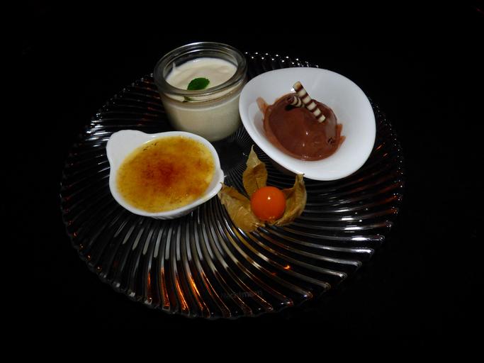 Keywords: dessert crème brûlée bruelee sweet dish french caramel vanilla sugar schokolandeneis ice chocolate elderflower mousse mousse elder elderberry syrup physalis cape gooseberry bladder cherry crystal plate plate