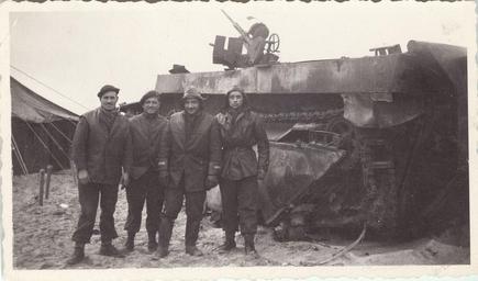 | Keywords: world war two worldwartwo second world war secondworldwar wwii tanks combat medics combatmedics netherlands scheldt canadian infantry canadianinfantry landing vehicle tracked landingvehicletracked lvt amtrac outdoor Members of the Royal Canadian Army Medical Corps in front of a destroyed Canadian alligator tank. Donald Carson was wounded when this tank hit a land mine. From the Donald Carson fonds, PR2011.0001/3. Members of the Royal Canadian Army Medical Corps in front of a destroyed Canadian alligator tank. Donald Carson was wounded when this tank hit a land mine. From the Donald Carson fonds, PR2011.0001/3. |