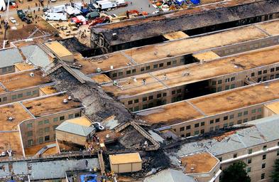| Keywords: An aerial view showing the level of the destruction at the Pentagon caused by a terrorist attack. The morning of September 11th, in an attempt to frighten the American people, five members of Al-Qaida, a terrorist group of fundamentalist Muslims, hijacked American Airlines Flight 77, then deliberately impacted the Pentagon killing all 64 passengers onboard and 125 people on the ground. The impact destroyed or damaged four of the five rings in that section of the building. Firefighters fought the fire through the night. The Pentagon was the third target by four hijacked aircraft, the twin towers of the World Trade Center (WTC) were the other targets, and one unknown when the passengers brought the aircraft down in a Pennsylvania field.9/14/2001; catalog.archives.gov/id/6606206 National Archives (accessed 9/3/2016) Camera Operator: TSGT Cedric H. Rudisill, USAF Series: Combined Military Service Digital Photographic Files, 1982 - 2007 Record Group 330: Records of the Office of the Secretary of Defense, 1921 - 2008 An aerial view showing the level of the destruction at the Pentagon caused by a terrorist attack. The morning of September 11th, in an attempt to frighten the American people, five members of Al-Qaida, a terrorist group of fundamentalist Muslims, hijacked American Airlines Flight 77, then deliberately impacted the Pentagon killing all 64 passengers onboard and 125 people on the ground. The impact destroyed or damaged four of the five rings in that section of the building. Firefighters fought the fire through the night. The Pentagon was the third target by four hijacked aircraft, the twin towers of the World Trade Center (WTC) were the other targets, and one unknown when the passengers brought the aircraft down in a Pennsylvania field.9/14/2001; catalog.archives.gov/id/6606206 National Archives (accessed 9/3/2016) Camera Operator: TSGT Cedric H. Rudisill, USAF Series: Combined Military Service Digital Photographic Files, 1982 - 2007 Record Group 330: Records of the Office of the Secretary of Defense, 1921 - 2008 |