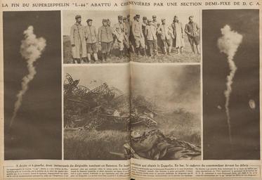 | Keywords: Destruction du Zeppelin L-44 a Chenevieres en 1917.jpg fr Photographies du dirigeable allemand L-44 abattu à Chenevières par la DCA française au retour d'un bombardement sur l'Angleterre Photographies publiées par l'hebdomadaire Le Miroir le 4 novembre 1917 en Photographs of the German airship L-44 slaughtered at Chenevière by the DCA Defense against aircraft when returning from a bombing raid on England Photographs published in the weekly Le Miroir November 4 1917 Approximate translation of the text Zeppelin airship L-44 Navy was shot at 1 200 meters Chenevières near Luneville This is the first of four airships which on October 20 ended tragically on French soil the bombing made ‹ ‹the day before in England The L-44 had just passed Luneville and would join Germany It was at 5 500 meters above sea level which is a great feat for an airship DCA section commanded by Lieutenant Fenouillet and lieutenant Curie managed to touch A fire broke out on board and made explosion before crashing vertically on the floor with his crew A witness took photographs of left and right showing the fall of the airship The top photograph shows the staff for the artillery section with the lieutenant Curie who set the fire Here also the airship debris next to the corpse of the commander of the L-44 1917-11-04 Le Miroir November 4 1917 page 8-9 via http //gallica bnf fr/ark /12148/cb40360453x/date1917 Gallica fr author anonymous-EU PD-US-1923 Uploaded with UploadWizard Zeppelin Le Miroir Chenevières World War I aircraft accidents |