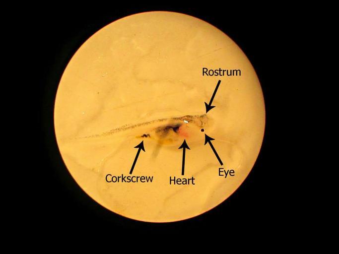 Keywords: Detail of American paddlefish fry - 2013.jpg en American paddlefish Polyodon spathula fry under the microscope at the Garrison Dam National Fish Hatchery in Riverdale North Dakota in the United States When they hatch paddlefish babies or fry are about the size of a thumbnail and semi-transparent This image shows some of the features of the fry Arrows point to the small bump on the nose that will develop into the paddlefish's rostrum its elongated bill the minute eyes and the small heart flushed pink with blood The corkscrew is technically known as the melamine plug The plug blocks the digestive tract until the fry is mature enough to digest food The it is absorbed by the fry at about two to three weeks of age and disappears http //www flickr com/photos/usfwsmtnprairie/9515281563/ Garrison Dam National Fish Hatchery Fish and Wildlife Service U S Department of the Interior 2013-08-15 Polyodon spathula PD-USGov |