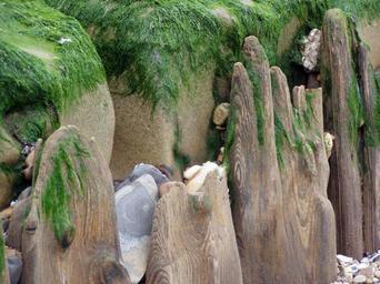 Keywords: detail beach washed out wood seaweed stones