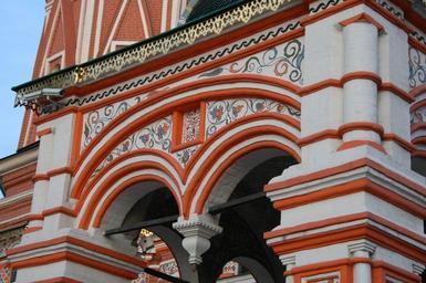 Keywords: detail building cathedral architecture russian orthodox ledges arches pillars decorative ornate red white
