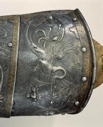| Keywords: Detalj av vänster lårskena till Erik XIVs rusting - Livrustkammaren - 22455.tif LSH artwork Eliseus Libaerts guldsmed sv Av driven stålplåt av sammanlagt sju delar <br/>Övre del av två större välvda skenor Övre kanten omvikt rundsmidd snett avtagen och lutande inåt Sidorna raka och släta Upptill en nitad triangulär sämskad läderbit med brun läderrem för att fästa lårpansaret i harnesket <br/>Knäbuckla välvd med övre och undre kant utdragen till spets och vertikal mittås Avsmalnade åt sidorna inåt tvärt avslutad och utåt övergående i oval mussla med rundade kanter och i mitten V-formig tvärt avslutad spets Över bucklan två mindre skenor under bucklan en mindre och en större skena Den synliga kanten utdragen till tre spetsar Yttre kanterna omvikta och rundsmidda Driven mittås löper över samtliga skenor även om den bitvis försvinner i dekoren I inre kant upptill och nertill söljor nertill sitter söljan i läderrem På motsvarande plats mot utsidan två läderremmar med rester av svärtning l 380 och 235 mm original caption Detalj av vänster lårskena till Erik XIV s rusting 1562 steel plate - leather Färg brun material läder - chamois leather Färg gul material sämskskinn g 1167 size mm 435 170 LRK Erik XIV av Sverige Sweden - A Royal Treasury 1988-1989 Tre Konungar på Åbo slott 1993 Örnen och de tre kronorna 2003 Parures Triomphales 2003 Sous l'égide de Mars Armures des Princes d'Europe' tid arbetstitel Armures et décors maniéristes francais 2011 Musée de l'Armée Maktspel - ett kostymdrama i Livrustkammaren 2014-2015 Livrustkammaren place of origin Antwerpen original filename lm_t11689 62754 inventory number LRK 26086 22455 CC-BY-SA Göran Schmidt <gallery caption Different images of same object > File Rustning tillhörande Erik XIV - Livrustkammaren - 22454 tif File Rustning - Livrustkammaren - 5330 tif File Rustning - Livrustkammaren - 82376 tif File Sadel till Erik XIV paradrustning från 1562 - Livrustkammaren - 13891 tif File Erik XIVs rustning från 1562 - Livrustkammaren - 73817 tif File Erik XIV rustning och sköld från 1562 i manieristisk stil - Livrustkammaren - 31016 tif </gallery> Eliseus Libaerts Tassets Göran Schmidt Media contributed by LSH unmatched creator Media contributed by LSH 2014-11 |
