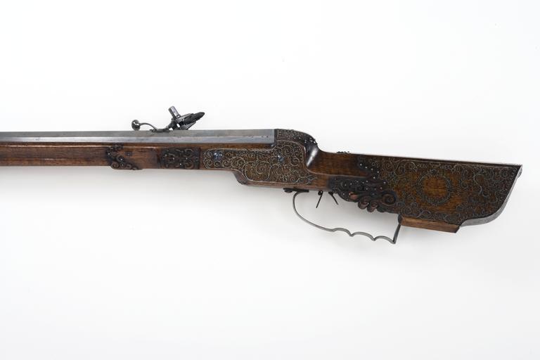 Keywords: Detalj hjullåsstudsare, v sida - Livrustkammaren - 65341.jpg Åttsidig åttaräfflad pipa av stål med plana bommar Kort rektangulärt svansskruvblad <br/>Riktmedel Inlaxade riktmedel Blånerat klaffsikte med den horisontella delen framtill vågformgad Stolpkorn av mässing <br/>Fästning Tre häften Pipan fäst med blånerad krysskruv underifrån varbygelskruven samt tre pipstift av stål <br/><br/>Hjullås av tysk typ plant låsbleck l 210 mm invändigt hjul Fängpanna med rundad framkant filad dekor bakåtböjd eldskärm fängpannelock med rörlig arm tryckknapp med runt huvud Hane med rundad hankropp med ås nederkanten liksom handstudeln balusterformad Ringformig graverad hanhals Lös överkäke med graverade linjer käkskruv med fyrsidigt huvud s-formigt fingergrepp med kulformig avslutning Hanfjäder med fasade kanter bakre delen bladformig profilerat fjäderlöv Stång avtryckarstång och hanstudel blånerade Fängpannelockets axel och hela slagfjädern brunerad <br/>Fästning Två blånerade låsskruvar <br/>Avtryckare med snälltryck allt blånerat Rektangulärt avtryckarbleck <br/><br/>Helstock av trä valnöt kolv av tysk typ med kolvlåda och vinge med kraftigt snidad volut framtill Kolvlådelock med ståltrådsdekor och snidade öglor med stålstift kartusch i ståltrådsorneringen Bakplåt och stödkula av stål På anslagssidan på kolvryggen runt låsskruvarna och svansskruvbladet ståltrådsinläggningar i form av rankor och inslagna stålstift på anslagets mitt en bladkrans Två sexpassformiga låsskruvbrickor av stål På framstockens bakre del snidade växtornament och bladvoluter med stålstift En punsad rand följer intill den snidade dekoren Överrörka av stål Näsband av horn Varbygel av stål med tre fingerlägen främre delens kanter fasade På kolvens undersida ett sigill med Stenbocksvapen under grevlig krona nedanför skölden bokstäverna I G S B G T B Johan Gabriel Stenbock Greve Till Bogesund <br/><br/>Tillbehör <br/>Laddstock av trä l 780 mm i ena änden en hornskoning l 25 mm i andra änden ett invändigt gängat stålrör l 145 mm original caption detalj hjullåsstudsare - LRK 3199 v sida<br/> Nyckelord Hjullåsstudsare Föremålsbild ca other date - 1650 1700 walnut e3 - eldvapen - stock material valnöt - steel e1247 - eldvapen - pipa lås riktmedel och beslag material stål - brass e4 - eldvapen - riktmedel material mässing g 4130 size mm 115 size mm 790 pipa size mm 1120 LRK Johan Gabriel Stenbock greve riksråd Basutställning Livrustkammarens basutställning 1978 I G S B G T B anv e3 - eldvapen - stock; Johan Gabriel Stenbock I G S B G T B anv e3 - eldvapen - stock; Johan Gabriel Stenbock place of origin original filename lm_dig2116 39776 inventory number LRK 3199 65341 CC-BY-SA Göran Schmidt <gallery caption Different images of same object > File Detalj hjullåsstudsare - Livrustkammaren - 56780 jpg </gallery> Göran Schmidt Musket images from Livrustkammaren color images Wheellock musket images from Livrustkammaren Media contributed by LSH unmatched material Media contributed by LSH dim-with multiple size templates Media contributed by LSH unmatched keyword Color images from Livrustkammaren Media contributed by LSH 2013-10