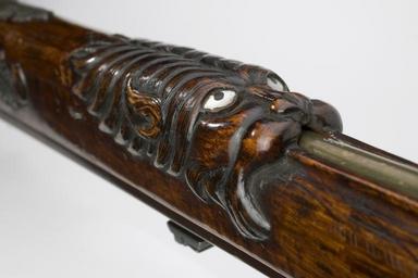 | Keywords: Detalj stockdekor slaglåsstudsare - Livrustkammaren - 39663.jpg Åttsidig brunerad räfflad pipa med trumf 8 räfflor högerräffling Pipan förlängd med ett obrunerat parti tvärt avskuret svansskruvblad graverad ranka På h sida vinge med tändhattsnippel På pipans översida graverad text under Bataillen vid Wiais och Helsinge d 28/9 1808 har Befälhafvaren för Svenska Finska Gardiet Conr Åkerhjelm tagit detta gevär från en rysk Jägare vid Regem n o 1 På kammarens v sida graverad text C Å 28/9 1808 på h sida C M Af R 1825 <br/>Riktmedel Klaffsikte av blånerat stål stolpkorn av mässing båda inlaxade <br/>Fästning Pipan fäst med blånerad krysskruv samt två engelska pipstift och däremellan rembygelns skruv <br/><br/>Slaglås av stål med välvt låsbleck och graverade bladrankor på hane och låsbleck bakåtliggande slagfjäder Harmynt slaghuvud nätskuret tumgrepp På låsets insida är slagfjäder stång och stångarm vända åt samma håll <br/>Fästning En låsskruv med åttsidig bricka <br/>Svagt böjd avtryckare Avtryckarbleck framtill avslutat med en urneformig platta med blad <br/><br/>Brun helstock av trä kolv av fransk typ med kindstöd och kolvlåda kolvhalsen nätskuren Rik snidad dekor på kolvens undersida ett fiskhuvud och på framstocken en lejonmaskaron båda med inlagda pärlemorögon samt snidade bladornament Bakom kindstödet en liggande hjort På kolvens undersida en oval vitmetall-plåt silver graverad med nr 1 Kolvlådelock med snidat tumgrepp med rund blomma locket öppnas genom att trycka på blommans mitt Näsband av horn övriga beslag av stål Bakplåt med en spetsig bladgraverad flik på kolvryggen Två runda rörkor Varbygel med graverade rankor fäst på avtryckarblecket En u-formig rembygel vid bakre rörka rund knapp bakom varbygeln <br/><br/>Tillbehör <br/>Laddstock av mässing l 663 mm original caption detalj stockdekor slaglåsstudsare - LRK 3669<br/> Nyckelord Dekorerade Lejon Studsare Jaktvapen Föremålsbild Gustav V - other date ca 1800 ca 1850 wood e3 - eldvapen - stock material trä - steel e1247 - eldvapen - pipa lås riktmedel och beslag material stål - mother-of-pearl e8 - eldvapen - stockdekor material pärlemor - brass e4 - eldvapen - riktmedel material mässing g 4190 size mm 670 pipa size mm 1080 LRK Oscar II av Sverige -Norge Carl Magnus af Robson bergsråd Karl XV av Sverige-Norge Gustaf V av Sverige Conrad Reinhold Åkerhielm överste place of origin original filename lm_dig2133 40201 inventory number LRK 3669 39663 CC-BY-SA Göran Schmidt <gallery caption Different images of same object > File Detalj slaglåsstudsare - Livrustkammaren - 22541 jpg File Detalj slaglåsstudsare v sida - Livrustkammaren - 48224 jpg File Detalj stockdekor slaglåsstudsare - Livrustkammaren - 48221 jpg File Detalj slaglåsstudsare - Livrustkammaren - 39666 jpg File Detalj slaglåsstudsare - Livrustkammaren - 31103 jpg File Detalj stockdekor slaglåsstudsare - Livrustkammaren - 65343 jpg File Detalj stockdekor slaglåsstudsare - Livrustkammaren - 56782 jpg </gallery> Göran Schmidt Lions in decorative arts Gustav V of Sweden Musket images from Livrustkammaren color images Flintlock muskets images from Livrustkammaren Media contributed by LSH unmatched material Media contributed by LSH dim-with multiple size templates Media contributed by LSH unmatched keyword Color images from Livrustkammaren Percussion muskets images from Livrustkammaren Wood carving Media contributed by LSH 2013-10 |