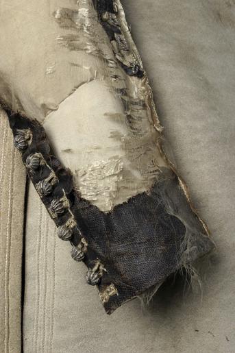 | Keywords: Detaljbild, ena armen på Gustav II Adolfs älghudsskyller från Dirschau, år 1627 - Livrustkammaren - 73840.tif Kyller använt av Gustav II Adolf vid Dirschau den 6 augusti 1627 w Buff coat used by Gustavus Adolphus of Sweden at the Kyller av älghud med ärmar av siden numera endast fragment kvar Kyllret är kraglöst och avskuren i midjan med långa skört 4 stycken <br/><br/>Längd mitt fram liv 36 5 cm skört 41 5 cm <br/>Bröstvidd 105 cm <br/>Längd mitt bak liv 41 5 cm skört 40 5 cm <br/>Ryggbredd 40 cm <br/>Midja 106 cm <br/>Vidd skörtens nederkant 281 cm <br/>Längd i sida liv 24 cm skört 43 3 cm <br/>Axelbredd 17 6 cm <br/>Ärmlängd 69 cm största ärmvidd 34 cm ärmvidd nedtill 28 cm <br/>Ärmsprundet är 18 cm Åtta knapphål vänster ärm har 4 silvertrådsklädda knappar och höger ärm har 7 knappar kvar <br/>Ärmens innersöm har en 15 5 cm lång öppning med 8 öglor av silvertråd på var sida över var ögla sitter en sydd träns av sysilke <br/><br/>Sömmarna runt framkant hals på axlar och längs skörtens sidor är dekorationsstickade med tre parallella sömmar i vit lintråd Snörning mitt fram med nio grupper med två hål i varje grupp på var sida Snörningen har blodfläckar Skörtets söm mitt bak på höger bakstycke har gått upp ca 1 cm Ärmarna har rester av sitt yttertyg ett ljust brun atlas samt ett foder av ljust brun taft Kyllret har axelkarmar och endast mycket små rester av atlasen finns kvar däremot återstår det mörkt bruna kanvasen som utgjort mellanlägg i tre lager tyg Kanvasen är belagd med en yta för styvnadens skull Livet i kyllret är fodrat med vitt linne förmodligen som mellanfoder w Buff coat of elk hide with sleeves made of silk of which now only fragments remain The coat is collarless and seamed at the waist with long skirts in four pieces Detail of the sleeve structure Center front length body 36 5 cm 41 5 cm skirts Chest 105 cm Center back length 41 5 cm body skirts 40 5 cm Back width 40 cm Waist 106 cm Width skirt hem 281 cm Length at side body 24 cm 43 3 cm skirts Shoulder Width 17 6 cm Sleeve length 69 cm Maximum sleeve width 34 cm Sleeve width at bottom 28 cm Sleeve opening 18 cm Sleeves have eight buttonholes; the left sleeve has four silver-wrapped thread covered buttons and the right sleeve has seven buttons left The coat's inseam has a 15 5 cm long opening with 8 loops of silver wire On each side of the loop is a stitched tack of sewing silk The seams around the front edge of the neck the shoulders and along the sides of skirt are decorated with three parallel rows of stitching in white linen thread The lacing at the front has nine groups of two holes in each group on each side The lacing has blood stains Skirt seam at center back on the right rear panel has gone up about 1 cm The sleeves have the remains of their outer shell a light brown silk atlas satin and a lining of light brown taffeta The coat has shoulder wings with only small remnants of the atlas remaining over the dark brown the canvas that formed inserts in the three-layer fabric The canvas is coated with a surface for stiffenings' sake The body of the coat is lined with white linen presumably as interlining original caption Detaljbild ena armen på Gustav II Adolfs älghudsskyller från Dirschau år 1627 - LRK 31194 Slaget vid Dirschau Battle of Dirschau 1627 silk d1 - dräkt - yttermaterial material siden size mm 365 mitt fram LRK Gustav II Adolf av Sverige Gustavus Adolphus of Sweden Basutställning Gustav II Adolf Minnesutställning 1932 1932 place of origin original filename lm_dig0489 67807 inventory number LRK 31194 73840 CC-BY-SA Göran Schmidt <gallery caption Different images of same object > File Kyller Dirschau - Livrustkammaren - 60031 tif File Kyller använt av Gustav II Adolf vid Dirschau den 6 augusti 1627 - Livrustkammaren - 61181 tif File Detaljbild på axelstycke Gustav II Adolfs älghudsskyller från Dirschau år 1627 - Livrustkammaren - 65278 tif File Detaljbild på ärm Gustav II Adolfs älghudsskyller från Dirschau år 1627 - Livrustkammaren - 22477 tif File Kyller Dirschau - Livrustkammaren - 42910 tif File Kyller använt av Gustav II Adolf vid Dirschau den 6 augusti 1627 - Livrustkammaren - 44060 tif File Gustav II Adolfs dräkt från slaget vid Dirschau 1627 - Livrustkammaren - 56717 tif File Kyller använt av Gustav II Adolf vid Dirschau den 6 augusti 1627 - Livrustkammaren - 35501 tif File Detaljbild på tyg Gustav II Adolfs älghudskyller från Dirschau år 1627 - Livrustkammaren - 13914 tif File Kyller Dirschau - Livrustkammaren - 51470 tif File Kyller använt av Gustav II Adolf vid Dirschau den 6 augusti 1627 - Livrustkammaren - 52620 tif </gallery> Göran Schmidt Media contributed by LSH unmatched event Media contributed by LSH unmatched material Media contributed by LSH unmatched objKeyword Color images from Livrustkammaren Buff coats Thread-covered buttons Clothes of Gustav II Adolf Media contributed by LSH 2013-10 |