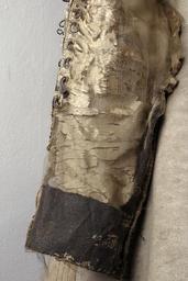 | Keywords: Detaljbild på ärm, Gustav II Adolfs älghudsskyller från Dirschau år 1627 - Livrustkammaren - 22477.tif Kyller använt av Gustav II Adolf vid Dirschau den 6 augusti 1627 w Buff coat used by Gustavus Adolphus of Sweden at the Kyller av älghud med ärmar av siden numera endast fragment kvar Kyllret är kraglöst och avskuren i midjan med långa skört 4 stycken <br/><br/>Längd mitt fram liv 36 5 cm skört 41 5 cm <br/>Bröstvidd 105 cm <br/>Längd mitt bak liv 41 5 cm skört 40 5 cm <br/>Ryggbredd 40 cm <br/>Midja 106 cm <br/>Vidd skörtens nederkant 281 cm <br/>Längd i sida liv 24 cm skört 43 3 cm <br/>Axelbredd 17 6 cm <br/>Ärmlängd 69 cm största ärmvidd 34 cm ärmvidd nedtill 28 cm <br/>Ärmsprundet är 18 cm Åtta knapphål vänster ärm har 4 silvertrådsklädda knappar och höger ärm har 7 knappar kvar <br/>Ärmens innersöm har en 15 5 cm lång öppning med 8 öglor av silvertråd på var sida över var ögla sitter en sydd träns av sysilke <br/><br/>Sömmarna runt framkant hals på axlar och längs skörtens sidor är dekorationsstickade med tre parallella sömmar i vit lintråd Snörning mitt fram med nio grupper med två hål i varje grupp på var sida Snörningen har blodfläckar Skörtets söm mitt bak på höger bakstycke har gått upp ca 1 cm Ärmarna har rester av sitt yttertyg ett ljust brun atlas samt ett foder av ljust brun taft Kyllret har axelkarmar och endast mycket små rester av atlasen finns kvar däremot återstår det mörkt bruna kanvasen som utgjort mellanlägg i tre lager tyg Kanvasen är belagd med en yta för styvnadens skull Livet i kyllret är fodrat med vitt linne förmodligen som mellanfoder w Buff coat of elk hide with sleeves made of silk of which now only fragments remain The coat is collarless and seamed at the waist with long skirts in four pieces Detail of sleeve Center front length body 36 5 cm 41 5 cm skirts Chest 105 cm Center back length 41 5 cm body skirts 40 5 cm Back width 40 cm Waist 106 cm Width skirt hem 281 cm Length at side body 24 cm 43 3 cm skirts Shoulder Width 17 6 cm Sleeve length 69 cm Maximum sleeve width 34 cm Sleeve width at bottom 28 cm Sleeve opening 18 cm Sleeves have eight buttonholes; the left sleeve has four silver-wrapped thread covered buttons and the right sleeve has seven buttons left The coat's inseam has a 15 5 cm long opening with 8 loops of silver wire On each side of the loop is a stitched tack of sewing silk The seams around the front edge of the neck the shoulders and along the sides of skirt are decorated with three parallel rows of stitching in white linen thread The lacing at the front has nine groups of two holes in each group on each side The lacing has blood stains Skirt seam at center back on the right rear panel has gone up about 1 cm The sleeves have the remains of their outer shell a light brown silk atlas satin and a lining of light brown taffeta The coat has shoulder wings with only small remnants of the atlas remaining over the dark brown the canvas that formed inserts in the three-layer fabric The canvas is coated with a surface for stiffenings' sake The body of the coat is lined with white linen presumably as interlining original caption Detaljbild på ärm Gustav II Adolfs älghudsskyller från Dirschau år 1627 - LRK 31194 Slaget vid Dirschau Battle of Dirschau 1627 silk d1 - dräkt - yttermaterial material siden size mm 365 mitt fram LRK Gustav II Adolf av Sverige Gustavus Adolphus of Sweden Basutställning Gustav II Adolf Minnesutställning 1932 1932 place of origin original filename lm_dig0494 67807 inventory number LRK 31194 22477 CC-BY-SA Göran Schmidt <gallery caption Different images of same object > File Kyller Dirschau - Livrustkammaren - 60031 tif File Kyller använt av Gustav II Adolf vid Dirschau den 6 augusti 1627 - Livrustkammaren - 61181 tif File Detaljbild på axelstycke Gustav II Adolfs älghudsskyller från Dirschau år 1627 - Livrustkammaren - 65278 tif File Kyller Dirschau - Livrustkammaren - 42910 tif File Kyller använt av Gustav II Adolf vid Dirschau den 6 augusti 1627 - Livrustkammaren - 44060 tif File Gustav II Adolfs dräkt från slaget vid Dirschau 1627 - Livrustkammaren - 56717 tif File Kyller använt av Gustav II Adolf vid Dirschau den 6 augusti 1627 - Livrustkammaren - 35501 tif File Detaljbild ena armen på Gustav II Adolfs älghudsskyller från Dirschau år 1627 - Livrustkammaren - 73840 tif File Detaljbild på tyg Gustav II Adolfs älghudskyller från Dirschau år 1627 - Livrustkammaren - 13914 tif File Kyller Dirschau - Livrustkammaren - 51470 tif File Kyller använt av Gustav II Adolf vid Dirschau den 6 augusti 1627 - Livrustkammaren - 52620 tif </gallery> Göran Schmidt Media contributed by LSH unmatched event Media contributed by LSH unmatched material Media contributed by LSH unmatched objKeyword Color images from Livrustkammaren Buff coats Clothes of Gustav II Adolf Media contributed by LSH 2013-10 |