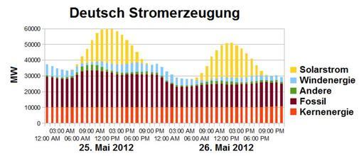 | Keywords: Deutsch Stromerzeugung 25-26-Mai-2012.png de Deutsch Stromerzeugung 25-26-Mai-2012 - 22 000 MW Solarstrom 2012-06-17 own Data is fromhttp //www transparency eex com/en/ one day at a time for actual wind solar and >100MW and then average the quarter hour data for wind and solar to combine it with the >100 MW data and then plotted using Open Office Nuclear is from the previous day datahttp //www transparency eex com/en/Voluntary 20Commitment 20of 20the 20Market 20Participants/Power 20generation/Previous-day-generation and transcribed one value at a time Delphi234 File Germany Electricity Generation 5-25-26-2012 png wikitable Datum Time Kernenergie Fossil Andere Wind Solarstrom - 2012-05-25 12 00 AM 10209 5 19028 6 969 1 6890 1 0 0 - 2012-05-25 01 00 AM 10226 4 18485 0 1014 8 6272 7 0 0 - 2012-05-25 02 00 AM 10211 4 17841 5 947 0 5655 1 0 0 - 2012-05-25 03 00 AM 10204 5 17650 1 940 9 5106 4 0 0 - 2012-05-25 04 00 AM 10209 2 17758 7 1004 5 4582 6 1 0 - 2012-05-25 05 00 AM 10217 8 18159 4 1155 6 4254 4 167 2 - 2012-05-25 06 00 AM 10238 1 20335 3 1550 2 3574 3 1356 9 - 2012-05-25 07 00 AM 10271 2 22508 0 2863 0 2098 9 4341 0 - 2012-05-25 08 00 AM 10274 5 23086 3 3286 8 1412 3 8971 3 - 2012-05-25 09 00 AM 10257 9 23196 4 3405 1 1705 9 13705 9 - 2012-05-25 10 00 AM 10254 8 23058 5 3290 4 2384 7 17553 1 - 2012-05-25 11 00 AM 10247 1 22710 8 2402 7 3464 4 20184 9 - 2012-05-25 12 00 PM 10235 8 22225 2 1575 4 4089 4 21724 3 - 2012-05-25 01 00 PM 10223 6 21753 0 1273 7 4378 4 22152 3 - 2012-05-25 02 00 PM 10217 8 20691 7 1542 8 4856 4 21301 6 - 2012-05-25 03 00 PM 10203 6 20355 8 1530 0 5108 2 19282 3 - 2012-05-25 04 00 PM 10204 9 20517 6 1364 5 5328 6 16058 2 - 2012-05-25 05 00 PM 10192 8 20845 0 1281 1 5800 0 11754 4 - 2012-05-25 06 00 PM 10190 7 20761 7 1527 7 5973 7 6975 8 - 2012-05-25 07 00 PM 10191 1 20540 0 1869 4 5323 6 2969 6 - 2012-05-25 08 00 PM 10201 7 20728 1 1931 1 4435 4 707 6 - 2012-05-25 09 00 PM 10208 4 20563 8 1406 4 4763 1 35 6 - 2012-05-25 10 00 PM 10211 6 20189 7 1640 4 5384 2 0 0 - 2012-05-25 11 00 PM 10195 6 18598 4 1203 6 5610 1 0 0 - 2012-05-26 12 00 AM 10159 6 15950 7 999 8 5800 0 0 0 - 2012-05-26 01 00 AM 10142 0 14446 4 941 1 5372 6 0 0 - 2012-05-26 02 00 AM 10147 2 12904 1 941 0 4669 3 0 0 - 2012-05-26 03 00 AM 10159 5 12704 2 1028 3 4298 6 0 0 - 2012-05-26 04 00 AM 10162 5 12725 9 1003 6 4119 2 1 0 - 2012-05-26 05 00 AM 10157 1 13033 0 821 3 3626 3 175 9 - 2012-05-26 06 00 AM 10173 9 13217 9 1116 5 2856 8 1392 4 - 2012-05-26 07 00 AM 10188 5 13926 6 1591 5 1535 9 4433 3 - 2012-05-26 08 00 AM 10186 4 14352 9 1604 4 778 4 9141 4 - 2012-05-26 09 00 AM 10174 8 14657 7 2242 4 1127 3 13994 3 - 2012-05-26 10 00 AM 10168 6 14402 9 2015 2 1645 7 17947 6 - 2012-05-26 11 00 AM 10148 5 14713 1 2116 9 2002 0 20519 3 - 2012-05-26 12 00 PM 10138 3 14301 4 2007 6 2336 1 21811 0 - 2012-05-26 01 00 PM 10136 3 14218 2 2068 6 2433 0 21914 2 - 2012-05-26 02 00 PM 10127 4 14238 2 1421 9 2621 5 20867 7 - 2012-05-26 03 00 PM 10121 3 14497 3 1216 9 2759 7 18684 2 - 2012-05-26 04 00 PM 10117 3 14551 3 1198 6 2953 9 15359 8 - 2012-05-26 05 00 PM 10103 2 14915 4 1526 9 3277 8 11099 1 - 2012-05-26 06 00 PM 10095 9 15224 8 1490 1 3135 7 6592 6 - 2012-05-26 07 00 PM 10095 2 15760 4 1481 2 2884 9 2885 1 - 2012-05-26 08 00 PM 10294 5 15754 7 1391 2 2382 6 748 0 - 2012-05-26 09 00 PM 10519 3 15188 1 1240 2 2634 9 41 6 - 2012-05-26 10 00 PM 10810 0 14979 2 1458 7 2951 9 0 0 - 2012-05-26 11 00 PM 10671 3 14387 9 1157 2 2922 7 0 0 cc-zero Uploaded with UploadWizard Solar energy in Germany Renewable energy statistics of Germany |