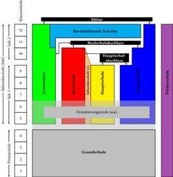 | Keywords: Deutsches Schulsystem.svg de Darstellung des deutschen Schulsystems Es beinhaltet die klassischen differenzierenden Schultypen Gymnasium Realschule Hauptschult die nichtdifferenzierenden Schultypen Grundschule Gesamtschule Sonder-/Förderschulen Special Schools und die drei häufigsten Schulabschlüsse Abitur Realschulabschluss Hauptschulabschluss en Diagram showing the German school system It includes the streaming school types Gymnasium Realschule Hauptschule the comprehensive school types Grundschule Gesamtschule Special Schools and the three main educational levels to be reached Abitur Realschulabschluss Hauptschulabschluss 2013-06-22 12 21 07 own Toscho Vocational schools are a set of many different school types partially sharing features with other school types ˜… State schools combining Hauptschule and Realschule There have different names in different Länder for example Sekundarschule ˜… ˜… The Orientierungsstufe grades 5 and 6 is differently implemented in the different Länder Berlin and Brandenburg implement it as a part of the Elementary school All the other Länder implement it as special conditions in the school types of secondary education during grade 5 and 6 Niedersachsen used to implement it as a dedicated school type comparable to Middle School cc-zero Uploaded with UploadWizard Education in Germany |