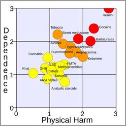 | Keywords: Development of a rational scale to assess the harm of drugs of potential misuse (physical harm and dependence, NA free means).svg A rational scale to assess the harm of drugs Data source is the March 24 2007 article Nutt David Leslie A King William Saulsbury Colin Blakemore Development of a rational scale to assess the harm of drugs of potential misuse The Lancet 2007; 369 1047-1053 PMID 17382831; doi 10 1016/S0140-6736 07 60464-4 The data in the paper were obtained solely from questionnaire results obtained from two groups of people the first comprised of people from the UK national group of consultant psychiatrists who were on the Royal College of Psychiatrists ™ register as specialists in addiction while the second comprised of people with experience in one of the many areas of addiction ranging from chemistry pharmacology and forensic science through psychiatry and other medical specialties including epidemiology as well as the legal and police services; the experts are not named and were chosen by the authors This is a tertiary source see Wikipedia policy on primary secondary tertiary sources as it summarizes experts' opinions on the matter which are secondary sources without any direct references to primary sources The data were first reported in appendix 14 of Drug classification making a hash of it http //news bbc co uk/1/shared/bsp/hi/pdfs/31_07_06_drugsreport pdf Based on http //download thelancet com/pdfs/journals/lancet/PIIS0140673607604644 pdf Development of a rational scale to assess the harm of drugs of potential misuse w de Benutzer Dosenfant 2014-04-02 AttribSVG Rational scale to assess the harm of drugs mean physical harm and mean dependence svg Apartmento2 SVG health Data prettytable sortable Drug Mean Physical harm + Mean Dependence Mean Physical harm<ref>NA is dropped/ignored in this mean-calculation</ref> Median Physical harm<ref>NA is dropped/ignored in the median-calculation</ref> Mean<sup>NA 0</sup> Physical harm<ref>NA is treated as zero in this mean-calculation</ref> Acute harm Chronic harm Intravenous harm Mean Dependence Pleasure Psychological Physical Mean Social harm Intoxication Social harm Health-care costs - Heroin 5 78 2 78 2 8 2 78 2 8 2 5 3 0 3 00 3 0 3 0 3 0 2 54 1 6 3 0 3 0 - Cocaine 4 72 2 33 2 0 2 33 2 0 2 0 3 0 2 39 3 0 2 8 1 3 2 17 1 8 2 5 2 3 - Barbiturates 4 24 2 23 2 3 2 23 2 3 1 9 2 5 2 01 2 0 2 2 1 8 2 00 2 4 1 9 1 7 - Tobacco 4 11 1 9 1 9 1 24 0 9 2 9 NA 2 21 2 3 2 6 1 8 1 42 0 8 1 1 2 4 - Alcohol 4 08 2 15 2 15 1 40 1 9 2 4 NA 1 93 2 3 1 9 1 6 2 21 2 2 2 4 2 1 - Street methadone 3 94 1 86 1 7 1 86 2 5 1 7 1 4 2 08 1 8 2 3 2 3 1 87 1 6 1 9 2 0 - Ketamine 3 54 2 00 2 1 2 00 2 1 1 7 2 1 1 54 1 9 1 7 1 0 1 69 2 0 1 5 1 5 - Amphetamine 3 48 1 81 1 8 1 81 1 3 1 8 2 4 1 67 2 0 1 9 1 1 1 50 1 4 1 5 1 6 - Benzodiazepines 3 46 1 63 1 7 1 63 1 5 1 7 1 8 1 83 1 7 2 1 1 8 1 65 2 0 1 5 1 5 - 4-MTA 3 45 2 15 2 15 1 44 2 2 2 1 NA 1 30 1 0 1 7 0 8 1 06 1 2 1 0 1 0 - Buprenorphine 3 24 1 60 1 3 1 60 1 2 1 3 2 3 1 64 2 0 1 5 1 5 1 49 1 6 1 5 1 4 - Cannabis 3 01 1 5 1 5 0 99 0 9 2 1 NA 1 51 1 9 1 7 0 8 1 50 1 7 1 3 1 5 - Solvents 2 91 1 9 1 9 1 28 2 1 1 7 NA 1 01 1 7 1 2 0 1 1 52 1 9 1 5 1 2 - Ecstasy 2 73 1 6 1 6 1 05 1 6 1 6 NA 1 13 1 5 1 2 0 7 1 09 1 2 1 0 1 1 - Methylphenidate 2 57 1 32 1 3 1 32 1 2 1 3 1 6 1 25 1 4 1 3 1 0 0 97 1 1 0 8 1 1 - GHB 2 49 1 3 1 3 0 86 1 4 1 2 NA 1 19 1 4 1 1 1 1 1 30 1 4 1 3 1 2 - LSD 2 36 1 13 1 4 1 13 1 7 1 4 0 3 1 23 2 2 1 1 0 3 1 32 1 6 1 3 1 1 - Anabolic steroids 2 33 1 45 1 7 1 45 0 8 2 0 1 7 0 88 1 1 0 8 0 8 1 13 1 3 0 8 1 3 - Khat 1 79 0 75 0 75 0 50 0 3 1 2 NA 1 04 1 6 1 2 0 3 0 85 0 7 1 1 0 8 - Alkyl nitrites 1 77 0 93 0 9 0 93 1 6 0 9 0 3 0 87 1 6 0 7 0 3 0 97 0 8 0 7 1 4 - <references /> http //news bbc co uk/1/shared/bsp/hi/pdfs/31_07_06_drugsreport pdf Drug classification making a hash of it Appendix 14 http //www thelancet com/journals/lancet/article/PIIS0140673607604644/abstract The Lancet 2007; 369 1047-1053 Nutt et al's drug harm chart SVG health Recreational drug use Drug policy reform ImageNote 1 313 25 28 14 380 380 2 Heroin ImageNoteEnd 1 ImageNote 2 268 71 28 28 380 380 2 Cocaine ImageNoteEnd 2 ImageNote 3 258 109 28 28 380 380 2 Barbiturates ImageNoteEnd 3 ImageNote 4 225 89 28 28 380 380 2 Tobacco ImageNoteEnd 4 ImageNote 5 250 117 28 28 380 380 2 Alcohol ImageNoteEnd 5 ImageNote 6 216 143 28 28 380 380 2 Amphetamine ImageNoteEnd 6 ImageNote 7 185 159 28 28 380 380 2 Cannabis ImageNoteEnd 7 ImageNote 8 110 206 28 28 380 380 2 Khat ImageNoteEnd 8 |