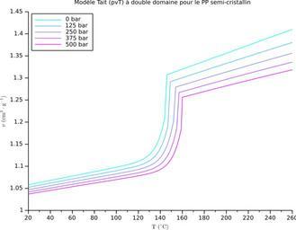 | Keywords: Diagramme pvt PP semi cristallin modele Tait.svg fr Diagramme pvT d'un polypropylène semi-cristallin selon le modèle Tait à double domaine en pvT diagram for a semicrystalline polypropylene according to the Tait two-domain model 2013-07-09 11 02 03 own data from book Jian WANG PVT Properties of Polymers for Injection Molding Intech 2012 17 978-953-51-0297-7 http //cdn intechopen com/pdfs/33643/InTech-Pvt_properties_of_polymers_for_injection_molding pdf Cdang cdang Scilab source <source lang scilab > // // nom courbes_pvT_PP sce // auteur Christophe Dang Ngoc Chan // date de création 2013-07-08 // dates de modification // 2013-07-09 pressions en bar étendu à 500 bar // 2013-07-10 calcul du coefficient de dilatation //---------------------------------------------------------------------------- // version de Scilab 5 4 1 // module Atoms requis aucun //---------------------------------------------------------------------------- // Objectif trace un faisceau de courbes v f p // pour des températures données // Entrées aucune codé en dur // Sorties fenêtre graphique // // Initialisation clear; // Constantes // masse volumique CNPT rho 9; // kg/m 3 // modèle Tait à double domaine uSI // m molten fondu ; s solide b1m 1 306e-3; // m3 kg-1 b2m 9 019e-7; // m3 kg-1 K-1 b3m 7 43e7; // Pa b4m 4 006e-3; // K-1 b1s 1 1195e-3; // m3 kg-1 b2s 4 929e-7; // m3 kg-1 K-1 b3s 1 319e8; // Pa b4s 3 355e-3; // K-1 b5 417 64; // K b6 3 0225e-7; // K Pa-1 b7 9 623e-5; // m3 kg-1 b8 1 338e-1; // K-1 b9 3 973e-8; // Pa-1 C 0 0894; // abscisse Npoints 240; // nombre de courbes Tcelsius round linspace 20 260 Npoints ; // °C T Tcelsius + 273 15; // K // gamme de pression Npress 5; // nombre de faisceaux pbar 0 1 round 10 linspace 0 500 Npress ; // bar p 1e5 pbar; // Pa // carte de couleur cmap coolcolormap Npress ; xset colormap cmap ; // Fonctions function tetoile Tetoile b5 t // Objectif calcule T du modèle Tait // entrées paramètre b5 scalaire réel // t matrice réelle // sorties matrice réelle tetoile t - b5; endfunction function Tt temperature_transition b5 b6 p // Objectif calcule Tt du modèle Tait // entrée paramètres b5 b6 scalaires réels // p matrice réelle // sortie Tt matrice réelle Tt b5 + b6 p; endfunction function v0 vol_spec_0 b1m b1s b2m b2s Tt t tetoile // objectif calculer le volume spécifique à pression 0 du modèle Tait // entrées paramètres b1m b1s b2m b2s Tt scalaires réels // T T matrices réelles indice t < Tt ; v0 indice b1s + b2s tetoile indice ; v0 ~indice b1m + b2m tetoile ~indice ; endfunction function B sensibilite_pression b3m b3s b4m b4s Tt t tetoile // objectif calculer la sensibilité à la pression B du modèle Tait // entrées paramètres b3m b3s b4m b4s Tt scalaires réels // T T matrices réelles indice t < Tt ; B indice b3s exp -b4s tetoile indice ; B ~indice b3m exp -b4m tetoile ~indice ; endfunction function v vt b7 b8 b9 Tt p t tetoile // objectif calculer vt du modèle Tait // entrées paramètres b7 b8 b9 Tt p scalaires réels // T T matrices réelles indice t < Tt ; v indice b7 exp b8 tetoile indice - b9 p ; v ~indice 0; endfunction function v vol_spec T b1m b2m b3m b4m b1s b2s b3s b4s b5 b6 b7 b8 b9 C p // objectif calculer le volume spécifique du modèle Tait // entrées paramètres b1 b9 C p scalaires réels // températures T matrice de réels // sorties volumes spécifiques v matrice de réels tetoile Tetoile b5 T ; Tt temperature_transition b5 b6 p ; v0 vol_spec_0 b1m b1s b2m b2s Tt T tetoile ; B sensibilite_pression b3m b3s b4m b4s Tt T tetoile ; v_t vt b7 b8 b9 Tt p T tetoile ; v v0 1 - C log 1 + p /B + v_t; endfunction // Programme principal scf 0 ; clf; xtitle Modèle Tait pvT à double domaine pour le PP semi-cristallin \mathrm T \ °\mathrm C v\ \mathrm cm 3\cdot\mathrm g -1 ; volume_specifique zeros Npress Npoints ; // initialisation for P 1 Npress // faisceaux v vol_spec T b1m b2m b3m b4m b1s b2s b3s b4s b5 b6 b7 b8 b9 C p P ; volume_specifique P v; plot2d Tcelsius 1000 v ; h gce ; h children foreground P; end legend string pbar 1 + bar string pbar 2 + bar string pbar 3 + bar string pbar 4 + bar string pbar 5 + bar 2 xpoly T 1 T 1 1 1 1 scf 1 ; clf; xtitle Coefficient de dilatation volumique isobare modèle Tait \mathrm T \ °\mathrm C \beta\ 10 -6 \mathrm K -1 ; coef_dilat zeros Npress Npoints-2 ; // initialisation beta_d zeros 1 Npoints-2 ; for P 1 Npress // faisceaux for i 2 Npoints-1 beta_d i-1 volume_specifique P i+1 - volume_specifique P i-1 / T i+1 - T i - 1 volume_specifique P i ; end plot2d Tcelsius 2 -1 1e6 beta_d' ; h gce ; h children foreground P; h parent data_bounds 2 2 2000; end legend string pbar 1 + bar string pbar 2 + bar string pbar 3 + bar string pbar 4 + bar string pbar 5 + bar 2 </source> cc-zero Uploaded with UploadWizard Physical properties of polymers Thermodynamic diagrams Polypropylene |