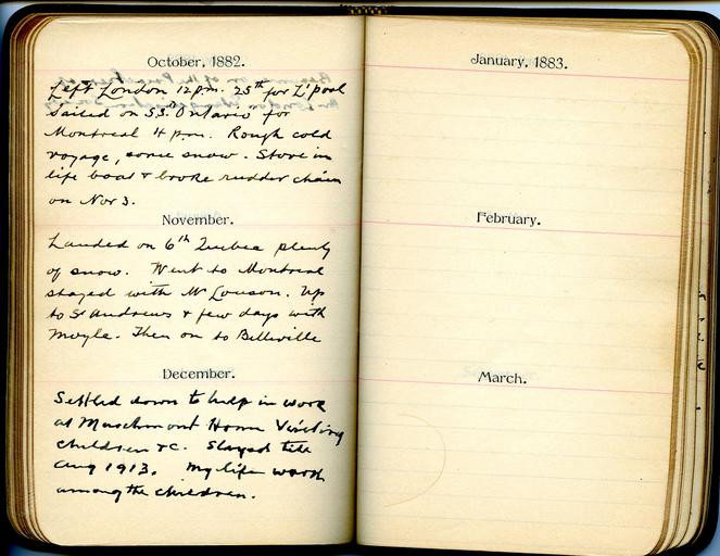 | Keywords: 1880s 1890s 1900s 1910s 1920s diaries home children homechildren document text writing indoor October 1882 Left London 12 pm, 25th for Liverpool. sailed on S. S. "Ontario" for Montreal 4 pm. Rough cold voyage, some snow. Stove in life boat and broke rudder chain on Nov 3. November 1882 Landed on 6th Quebec plenty of snow. Went to Montreal stayed with Mr. Louson. Up to St Andrews and few days with Moyle. Then on to Belleville. December 1882 Settled down to help in work at Marchmont Home visiting children &c. Stayed till August 1913. My life work among the children. October 1882 Left London 12 pm, 25th for Liverpool. sailed on S. S. "Ontario" for Montreal 4 pm. Rough cold voyage, some snow. Stove in life boat and broke rudder chain on Nov 3. November 1882 Landed on 6th Quebec plenty of snow. Went to Montreal stayed with Mr. Louson. Up to St Andrews and few days with Moyle. Then on to Belleville. December 1882 Settled down to help in work at Marchmont Home visiting children &c. Stayed till August 1913. My life work among the children. |